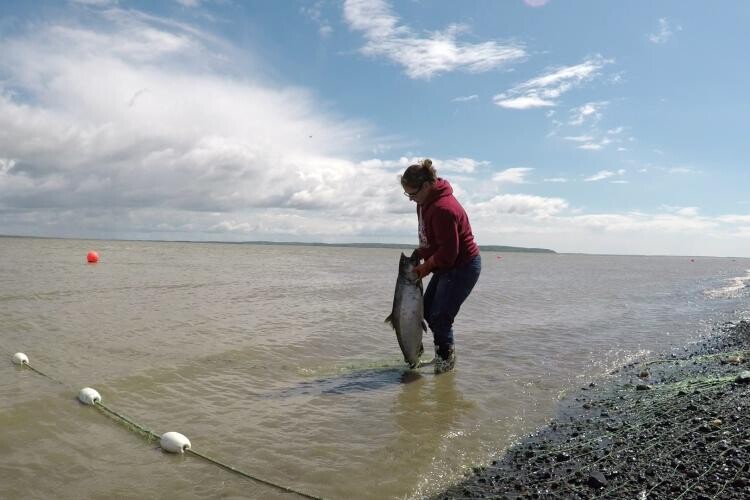 Misty Nielsen hauls in a king salmon at Kanakanak Beach, Dillingham. Credit: NOAA Fisheries.