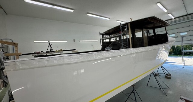 Building the 48-foot lobster boat marks a turnaround for Oceanville Boatworks. The May 2023 issue of National Fisherman’s Around the Yards column featured Oceanville Boatworks building and launching the 50-foot lobster boat Katherine Pennington. Haley was lamenting the fact that the launching marked the end of a 9-boat string of finishing off hulls for fishermen, as the next boat was a 44-foot pleasure boat.