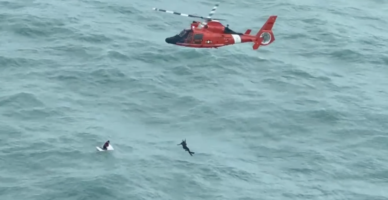 A Coast Guard Air Station Miami aircrew rescues a man clinging to a cooler 30 miles off Longboat Key, Fla., Oct. 9., 2024. Coast Guard video image.