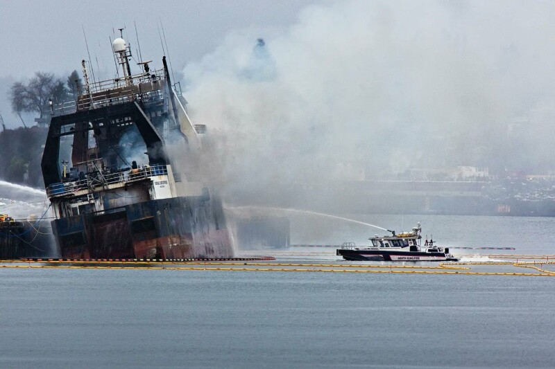 A fire broke out early April 8 on the catcher-processor Kodiak Enterprise docked in Tacoma, Wash. South King Fire and Rescue photo.
