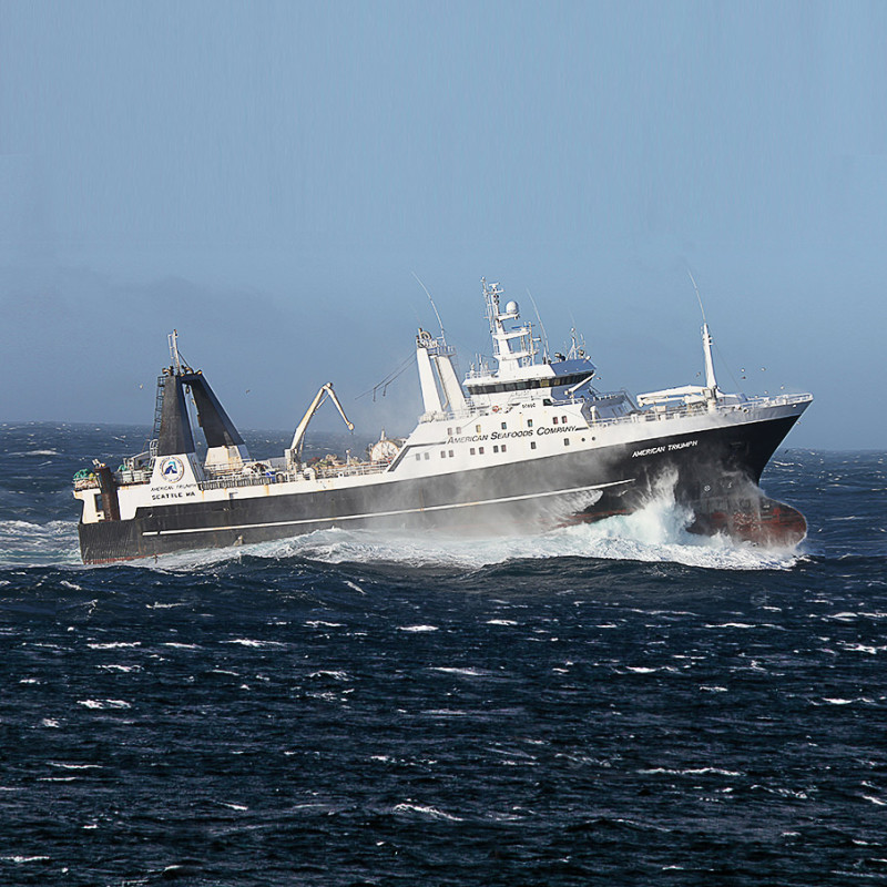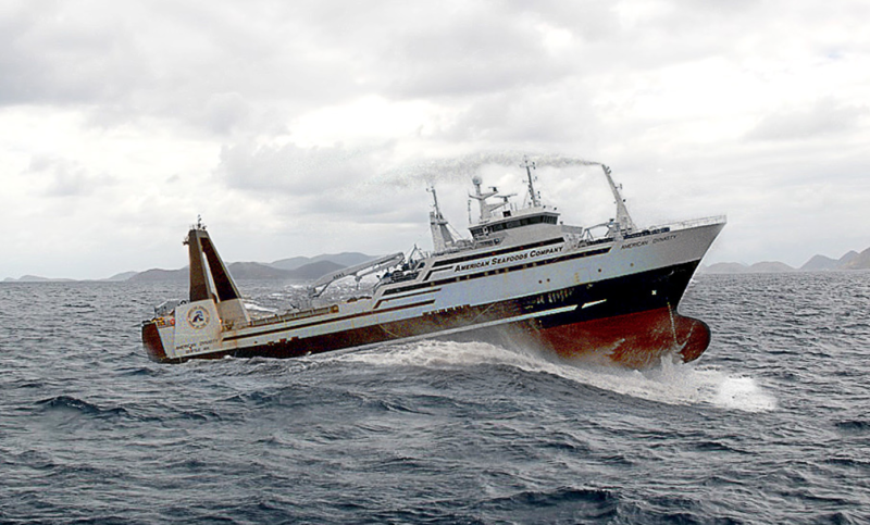 The American Triumph is one of six catcher-processor factory trawlers American Seafoods operates in the northern Pacific and Bering Sea. American Seafoods photo.