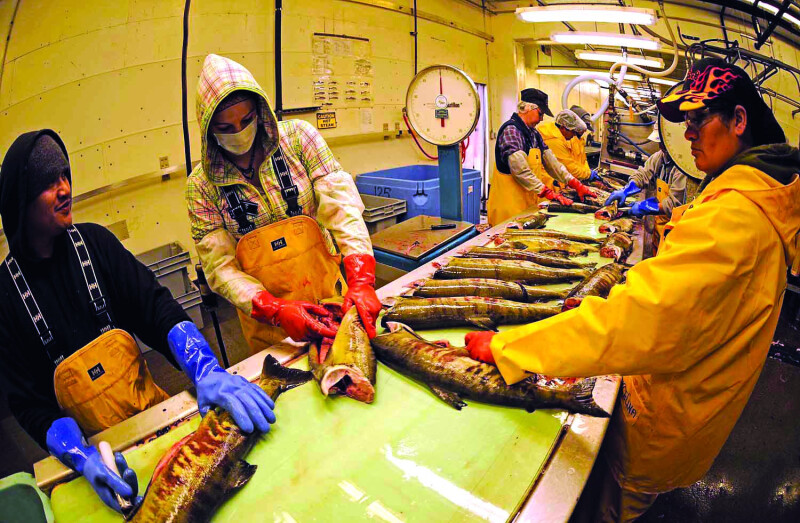 Workers process chum salmon at Trident Seafoods Petersburg's facility. Trident Seafood photo.