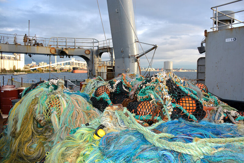 Nets on deck of a North Pacific trawler-processor in port at Seattle. The At-sea Processors Association fleet has won a new global certification for labor standards. Doug Stewart photo.