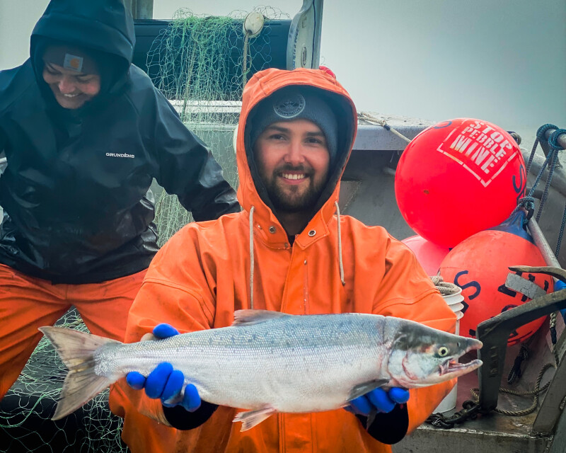 Crew member Jesse 'Oly' Oliver holds a sockeye, with crew member Ashley Miller behind. Nora Skeele photo.