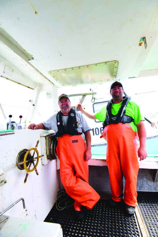 Mark and Matt Ring wear low-profile PFDs on the Stanley Thomas out of Gloucester, Mass. Kelli Park/NECOHS photo.
