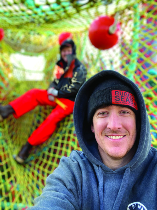 Taylor Strout and Ross Noy pick and mend the net in Dutch Harbor on the 150-foot pollock midwater trawler F/V Northern Defender for Global Seas out of Seattle. Photo by Taylor Strout