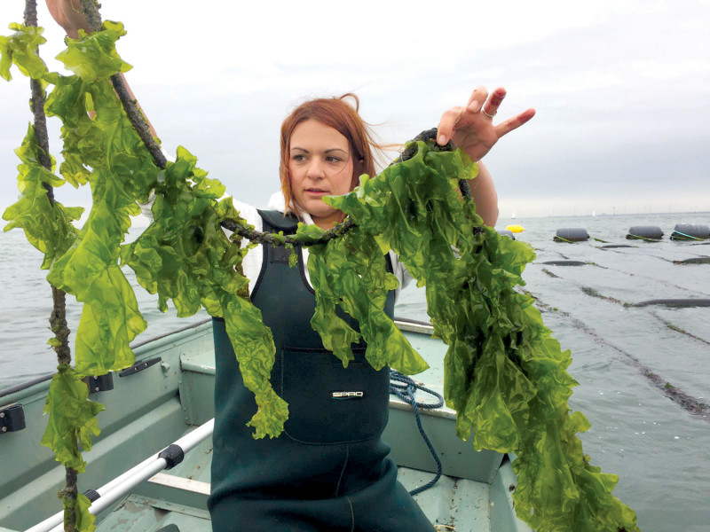 Julia Wald, from Seaweed Harvest Holland, shows ulva growing on lines. Olivier DeClerk photo.