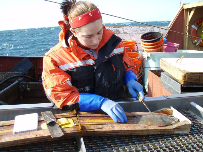 A NOAA observer collecting scale samples from a yellowtail flounder. NOAA photo.