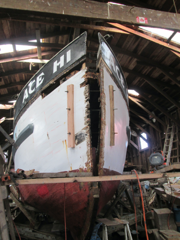 The Ace Hi’s rotten bow stem has been removed and will be replaced with a pepperwood bow stem. Hardwood anchor guards will be on both sides of the new stem. Makela Boatworks photo