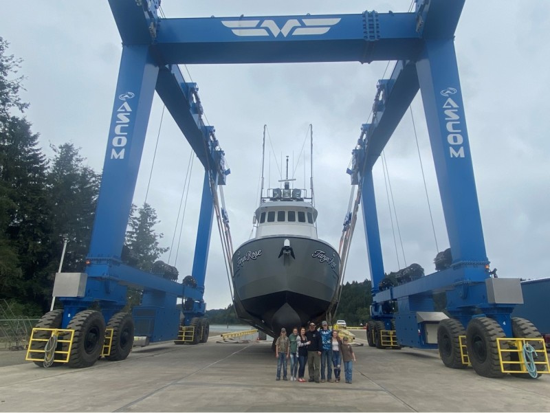 The Lillie M after being lengthened and sponsoned goes back in the water at Fred Wahl Marine Construction bearing its new name, Taryn Rose. Fred Wahl Marine Construction photo.