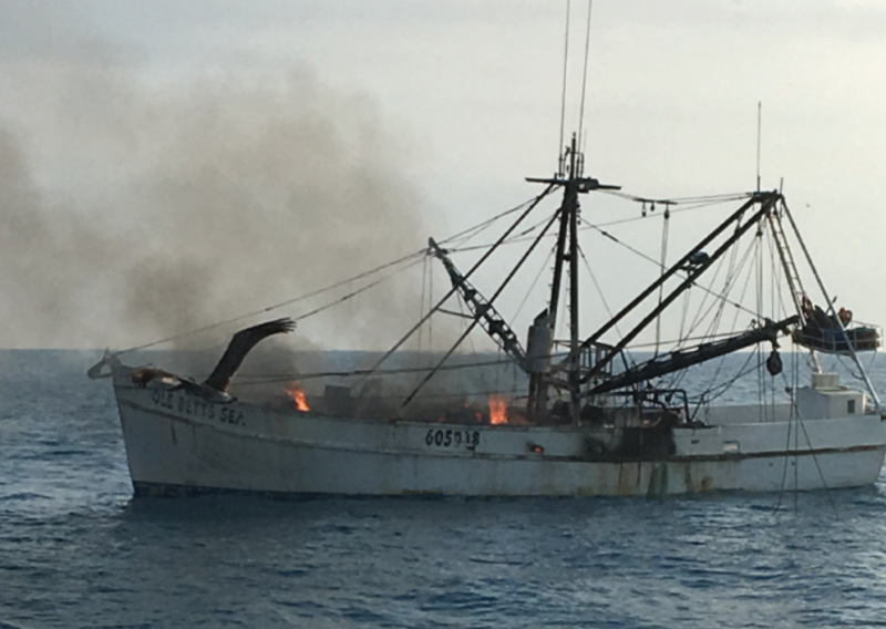 The 67-foot shrimp trawler Ole Betts Sea caught fire and burned in the Gulf of Mexico in March 2018. Trico Seafood photo