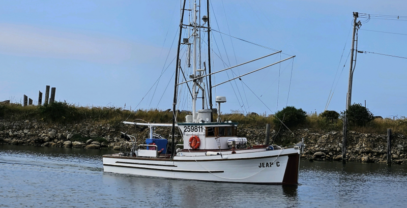The Jean C., a 35-foot salmon troller built in Washington about fifty years ago, was brought down from Newport, Ore., to be hauled at Zerlang & Zerlang in mid-May 2024. Zerlang & Zerlang photo.