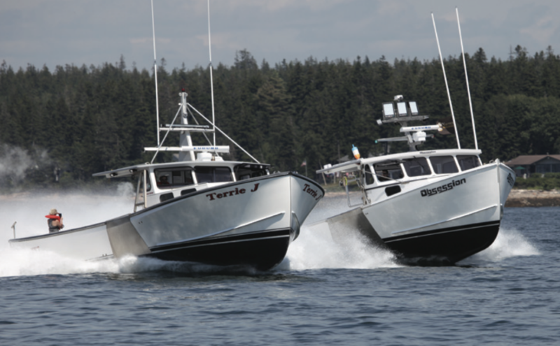 Kimberly Ann beats out Faith Melle with a speed of 38.1 mph in the World’s Fastest Working Lobster Boat race on Moosabec Reach. Jon Johansen photo.
