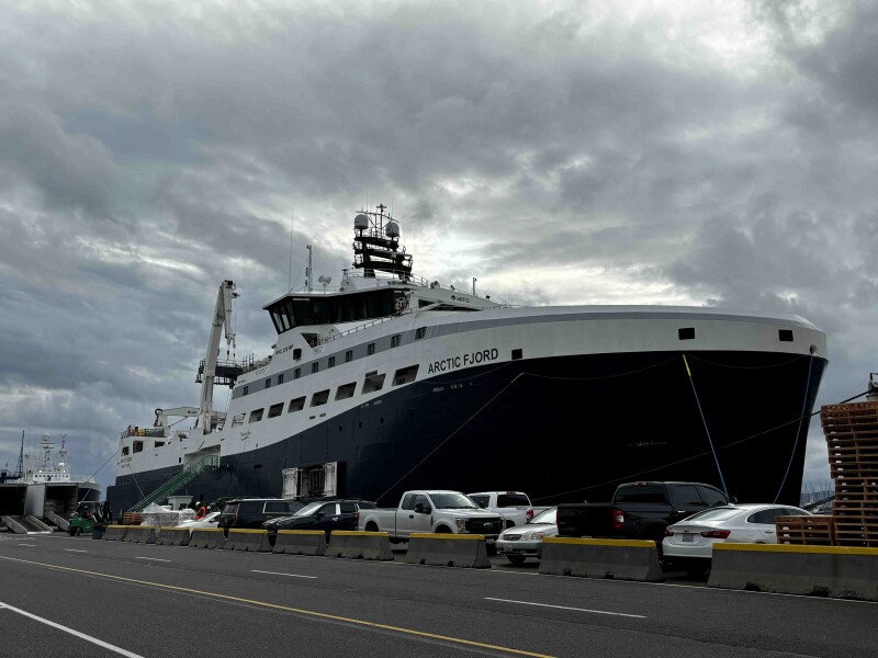 At 324 feet, with a total of six decks, the Arctic Fjord—Arctic Storm Group’s new catcher processor—cuts an imposing figure against a cloudy Seattle sky as the owners prepare it for its first trip to the Bering Sea. Photo by Paul Molyneaux
