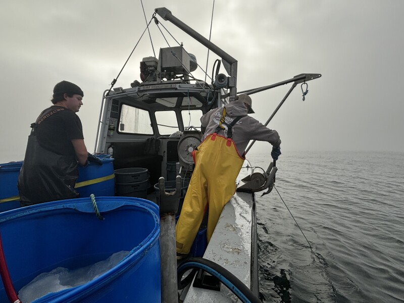 Deyerle and his cousin Hunter work through their gear in the fog of Monterey Bay. Deyerle used to work by himself but finds the work goes faster with a second person. Paul Molyneaux photo.
