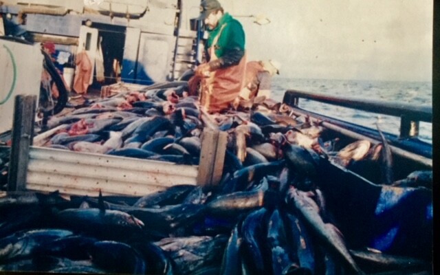 Pat McBride with a deckload of blackcod from the western Aleutians during the 1980s. Photo courtesy Barb McBride.