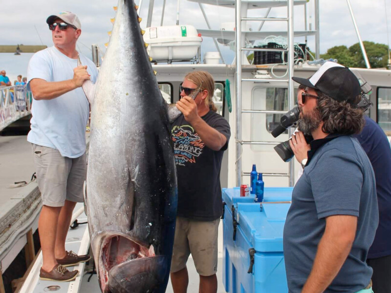 Kyle Grant, center, lands a bluefin at the 2018 Bluefin Blowout in Gloucester, Mass. Grant’s fish dressed out at 630-pounds and earned him second place. He is glad to see it back after a two-year hiatus due to the pandemic. F/V Battlewagon photo.