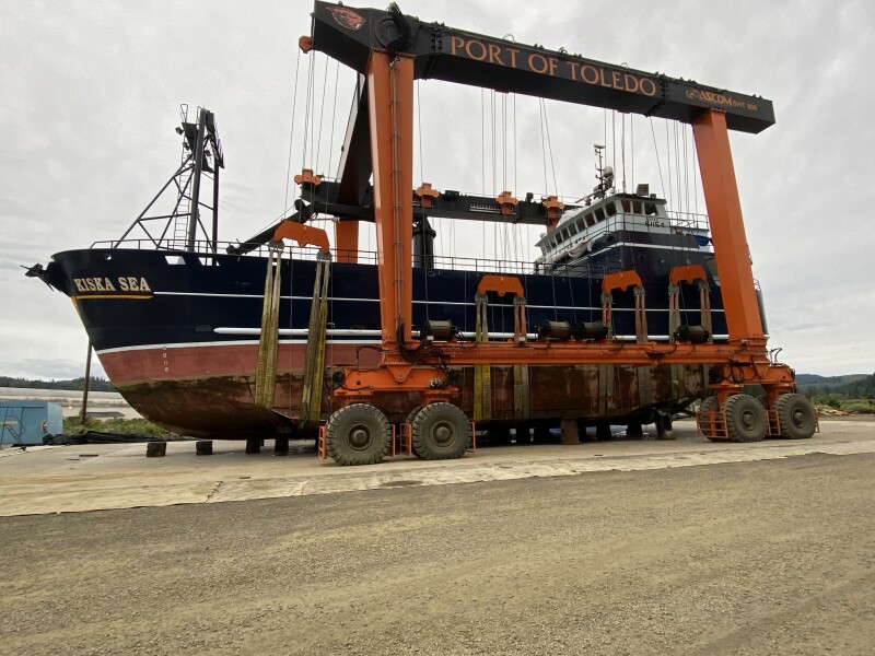 The Port of Toledo Shipyard’s 650-ton Ascom travel lift had no trouble bringing the 500-ton Alaska king crabber Kiska Sea ashore. The yard also has an 85-ton Acme lift for smaller vessels. Photo by Toledo Shipyard