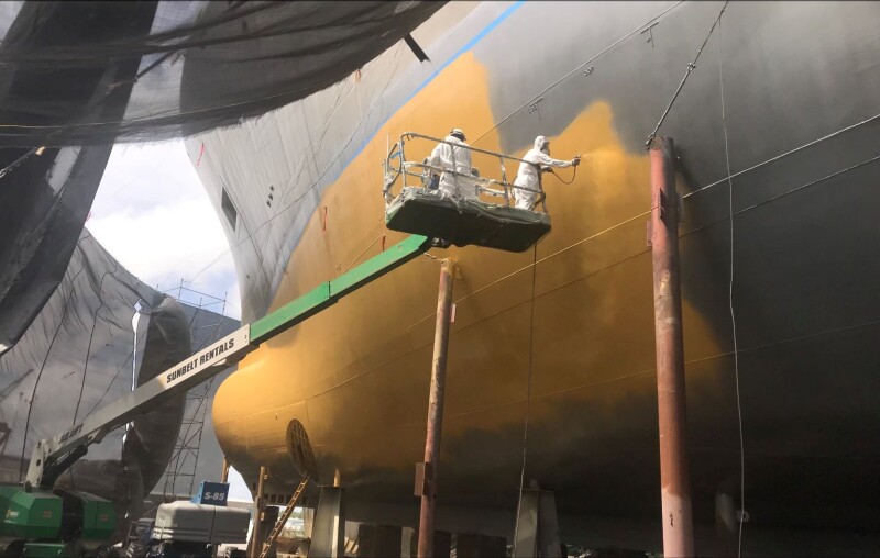Priming the finished hull in preparation for the Arctic Fjord’s signature blue and white colors. Photo courtesy of Arctic Storm
