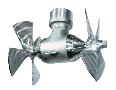 Each Wesmar thruster has two counter-rotating four-blade Kaplan propellers. The dual-prop system raises efficiency by splitting power between two different gear sets, and the wash from the forward propeller is picked up by the aft, creating greater thrust. Wesmar bow and stern thrusters run from 5- to 500-horsepower, and the effi-cient dual propellers add up to more thrust per horsepower unit. This means space savings on smaller boats.