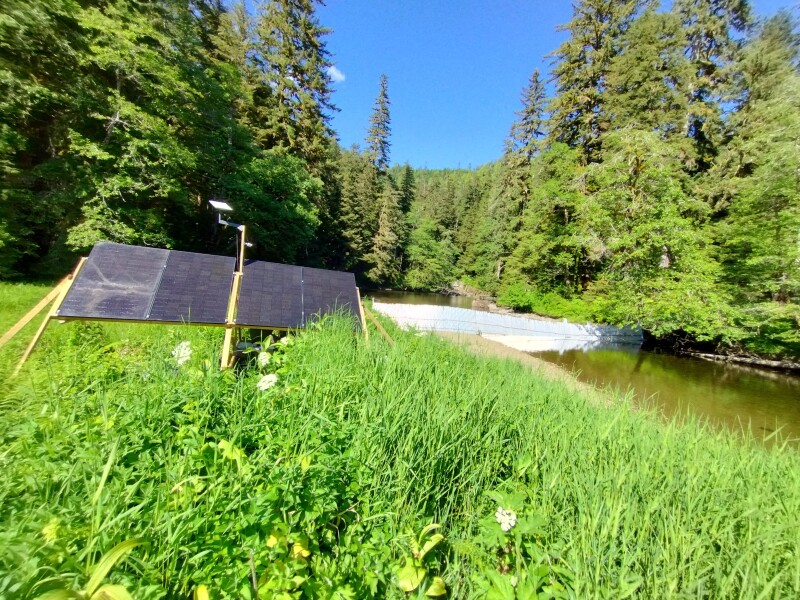 To count salmon returns, a weir funnels fish into a chute, where a camera activated by motion detection captures an image of every fish and sends it to the cloud via Starlink.