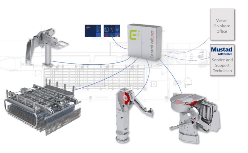 The components of Mustad’s E-Line Autoline system include the hauler and hook cleaner, line retriever, hook separator, magazines, and the SuperBaiter, all monitored and controlled through a control panel that can connect via satellite link to Mustad techn