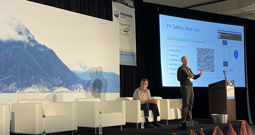The U.S. Coast Guard (USCG) presented its "Fishing Vessel Safety Program Updates" seminar during day two of the Pacific Marine Expo. The session detailed challenges and partnerships aimed at improving safety within the commercial fishing industry, also providing a look at the Coast Guard’s work on policy enforcement, marine casualty analysis, and outreach.
