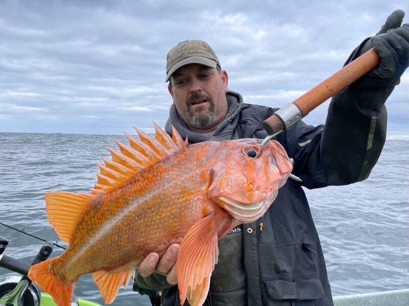 A surprise for the day, the author catches a canary rockfish. “The biggest one I’ve seen in 30 years out here,” Goins says. “Probably 20 years old.” Paul Molyneaux photo.