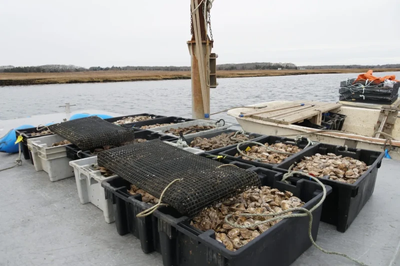 Crates of oysters sit on the dock of Blue Stream Shellfish in Fairhaven in January. Photo by Adam Goldstein / The New Bedford Light