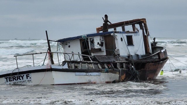 Dungeness crab boat Terry F. broke up and washed ashore off Westport, Wash., after setting out in rough weather on Saturday, Feb. 13, 2021. Washington Department of Ecology photo
