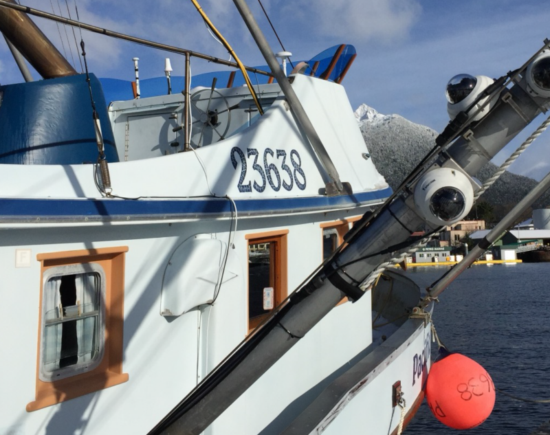 An electronic monitoring camera mounted on the troll pole of a commercial fishing boat in Southeast Alaska films all the fish coming on board from a longline set. AI will be used to review footage and recognize fish species for catch accounting. Alaska Longline Fishermen's Association photo.