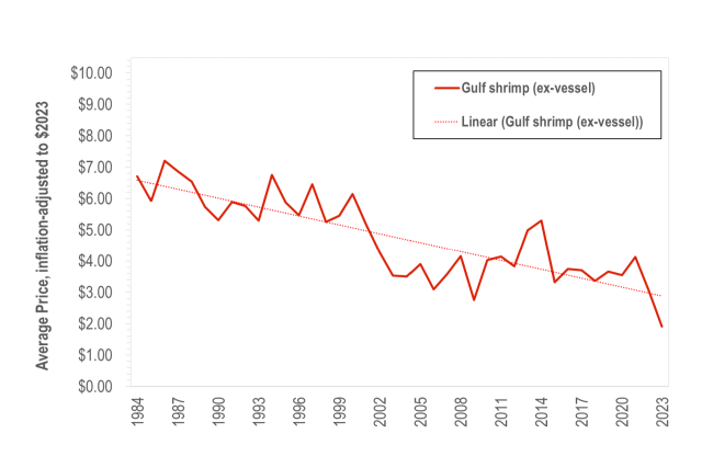 Increased aquaculture efficiency and lower-cost imports have pushed shrimp prices downward. Adjusted for inflation, the average price of Gulf shrimp has fallen from more than $6 per pound in the 1980s to less than $2 per pound in 2023.