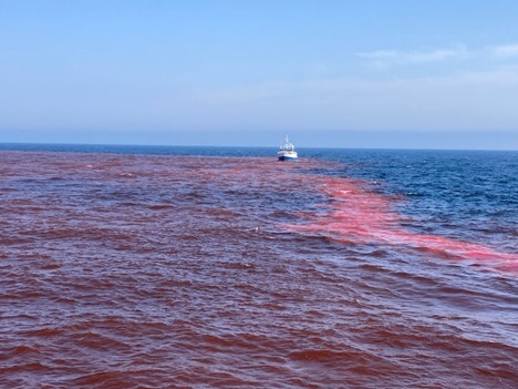 In an August 2025 field trial, researchers dispersed 16,200 gallons of sodium hydroxide tagged with a rhodamine tracer dye (visible in the red water color) to raise the alkalinity of a patch of seawater in the Gulf of Maine and calculate carbon uptake. Ph