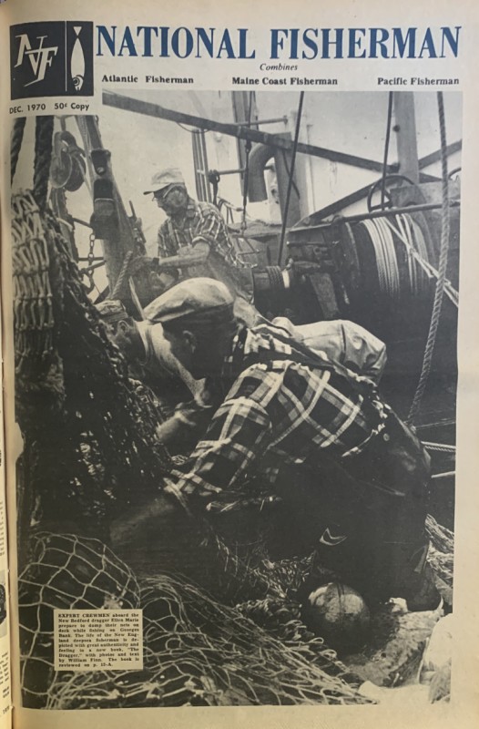 Expert crewmen aboard the New Bedford dragger Ellen Marie prepare to dump their nets on deck while fishing on Georges Bank. The life of the New England deep-sea fisherman is depicted with great authenticity and feeling in a new book, “The Dragger,” with photos and text by William Finn. (NF Cover December 1970)