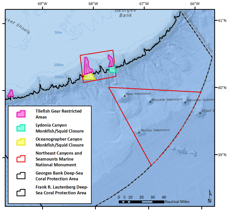 Under New England council management, the Northeast Canyons and Seamounts Marine National Monument includes a range of fishing restrictions, which will soon expand under a coral habitat amendment. The pink areas have tilefish gear restrictions; the yellow and green areas are closed to monkfish and squid fishing. The red area outlines the seamounts area. New England Fishery Management Council image.