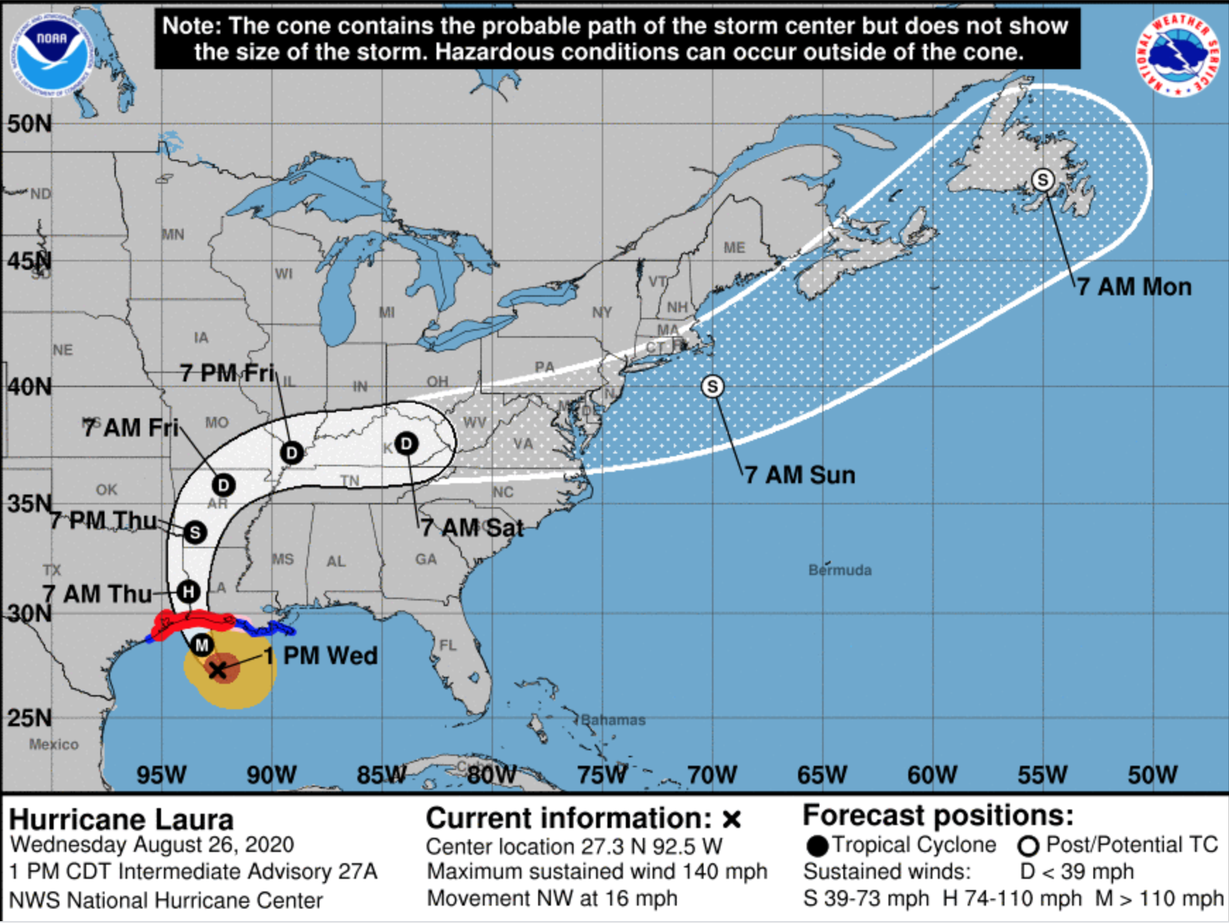 “Reports from an Air Force Reserve Hurricane Hunter aircraft indicate that maximum sustained winds have increased to near 145 mph with higher gusts. Laura is an extremely dangerous category 4 hurricane on the Saffir-Simpson Hurricane Wind Scale. Some additional strengthening is possible this evening before Laura reaches the northwest gulf coast overnight. Rapid weakening is expected after Laura makes over land.”