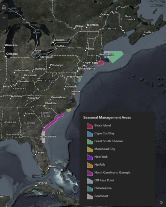 Map showing vessel speed zones along the U.S. East Coast. Most vessels 65 feet or longer must travel at 10 knots or less in these area under regulations to protect endangered North Atlantic right whales. NOAA graphic.