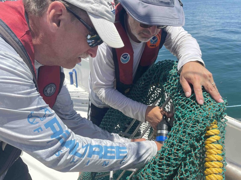 NOAA team members adjusting a small bar TED prototype for testing. NOAA Fisheries photo/Endangered Species Act permit 20339.