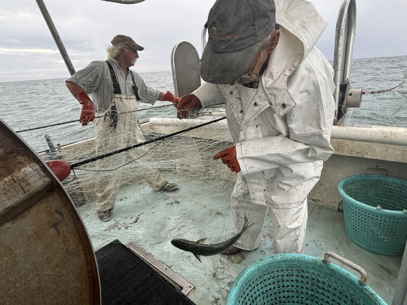 After setting on a promising indication of bait fish, crewman Robert Boyd (right) and captain Tommy Danchise (left) haul back the first of two 400-yard gillnets, landing about 50 pounds of bluefish, Spanish mackerel, and other species. Paul Molyneaux phot