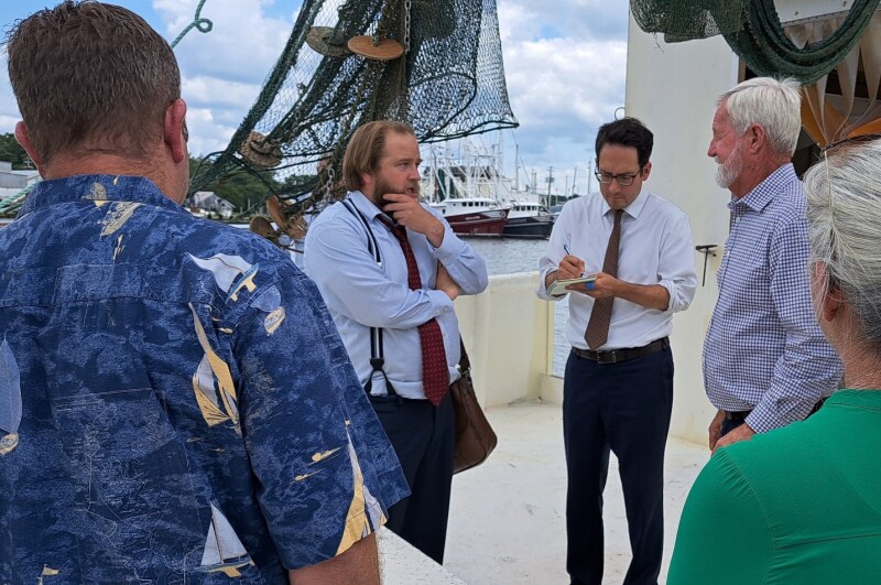 The SSA brought FTC commissioner Alvaro Bedoya (seen standing between FTC counsel Max Miller and SSA board member Steve Bosarge) to the Gulf to understand what U.S. shrimpers and fishing communities are up against. Photo by Southern Shrimp Alliance