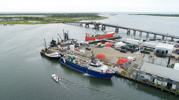 The F/V Enterprise (center) pictured at its dock at Lund's Fisheries at Cape May, N.J., was among mid-water trawlers pushed out of nearshore waters by a 2019 NMFS rule. Lund's Fisheries photo.