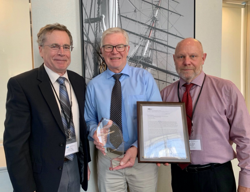 Lou Goodreau, center, flanked by New England Fishery Management Council Executive Director Tom Nies, left, and council chair Eric Reid. NEFMC photo.