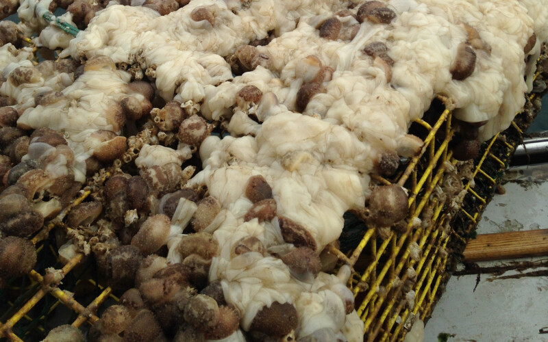 Sea squirts are also known as tunicates, meaning they are mobile within their first few days of life but then attach themselves to pilings, rocks, or anything fixed in place. The species will find a home on the wire of lobster traps on the bottom that have laid there long enough without movement. They have become a nuisance for aquaculturists by taking over nets and underwater cages and smothering the oysters within.