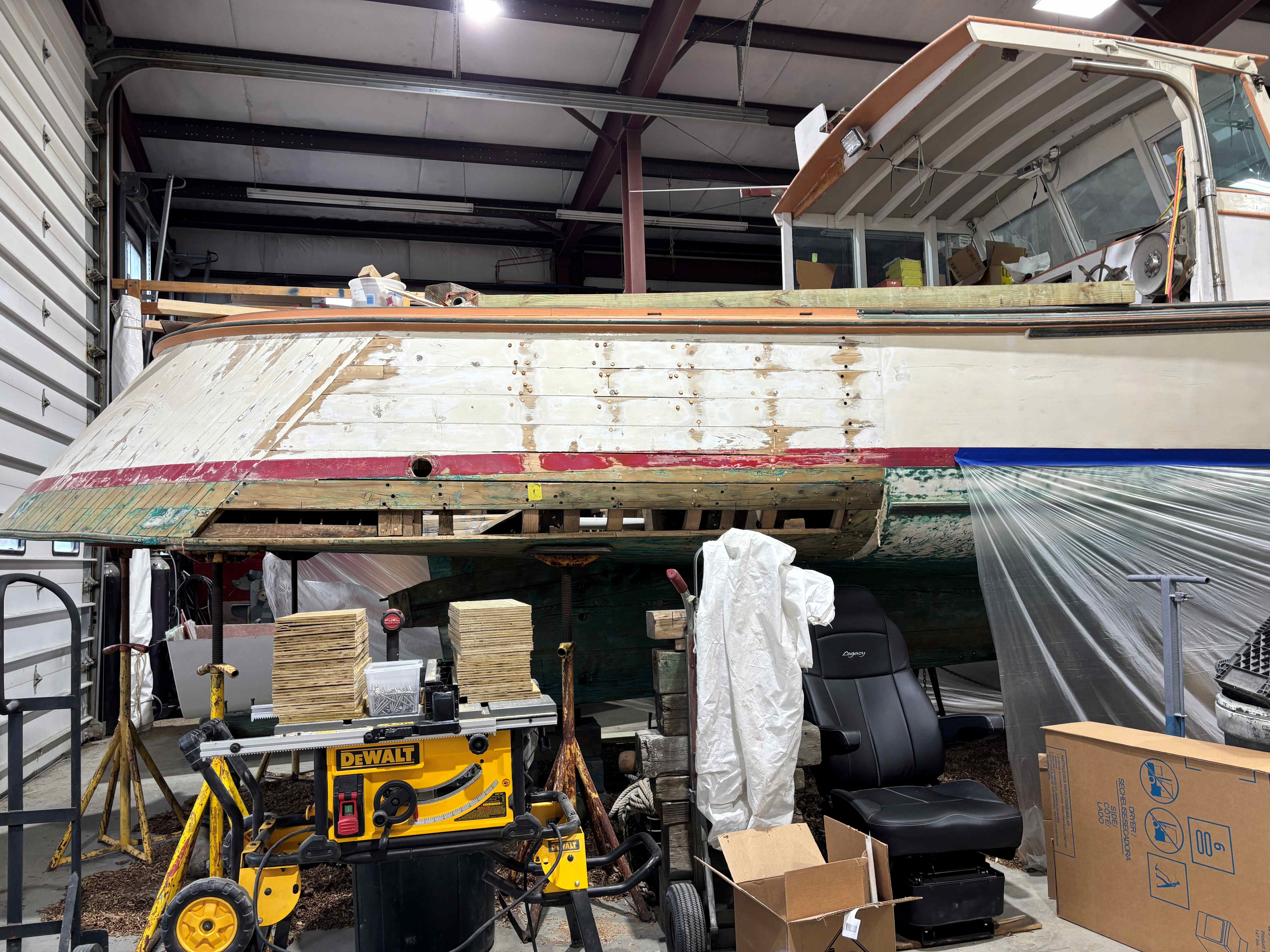 The current shop has room for two or three boats, and right now it holds a fiberglass sailboat and a classic torpedo stern wooden lobster boat. “They mostly built them in the 1930s,” says Johansen. “But this one was built in 1992.” Johansen notes that the torpedo stern requires some complex bevels that make it particularly challenging to repair. So he has a local wooden boat builder, Richard Stanley, come in and work on it. “He comes in when he can,” he says.