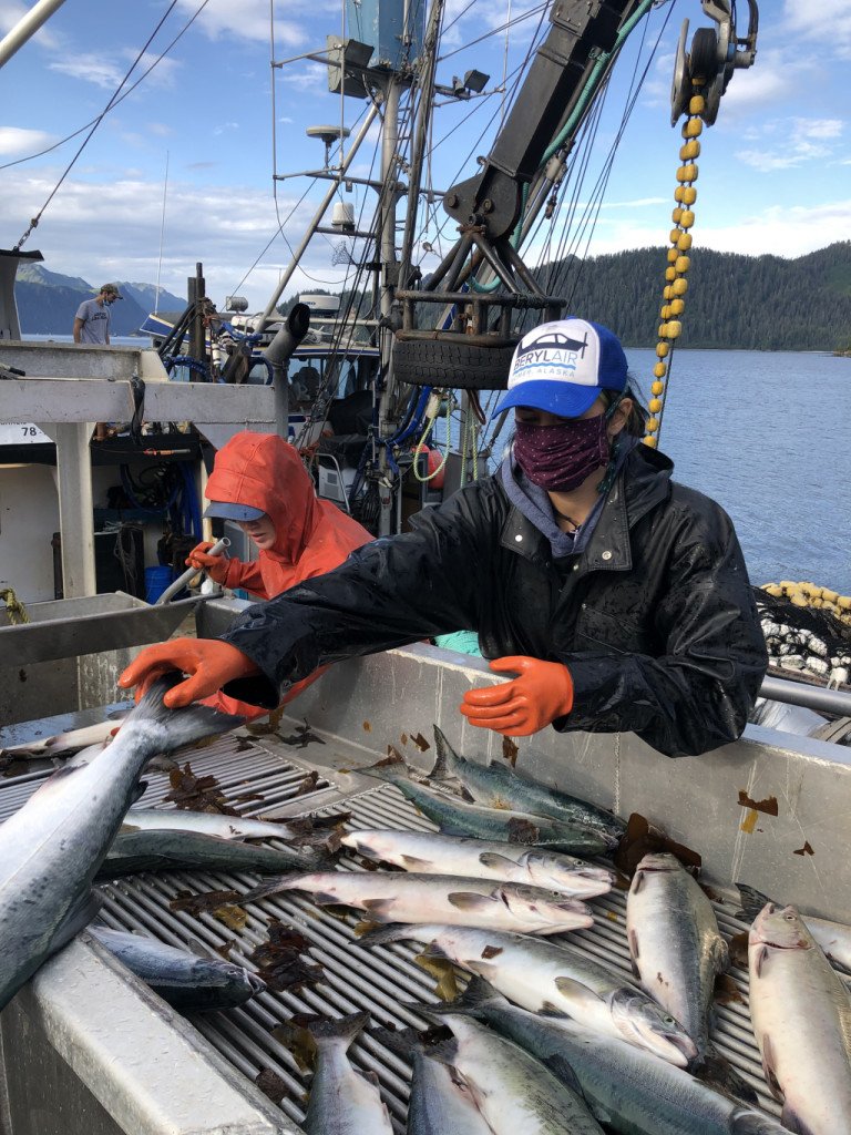 Last Set: Dasia Rose and Katie Miller work the sorting table on the tender Silver Spray after the F/V Centurion delivers a load of silver salmon in Prince William Sound.