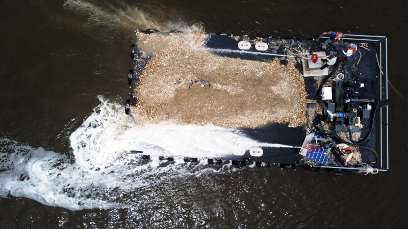 Workers using water cannons blow empty shells onto an oyster reef restoration site on New Jersey's Mullica River. NJ Division of Fish & Wildlife photo.