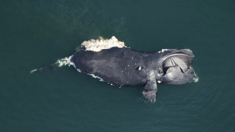 A dead female North Atlantic right whale found March 30 floating 50 miles offshore east of Back Bay National Wildlife Refuge, Va. Clearwater Marine Aquarium Research Institute photo/NOAA permit #24359.