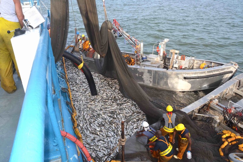 Menhaden fishermen handle a purse seine full of fish in Chesapeake Bay. A bill before the Virginia House of Delegates is recommending a three year study of Atlantic Menhaden in Virginia waters. Larry Chowning photo.