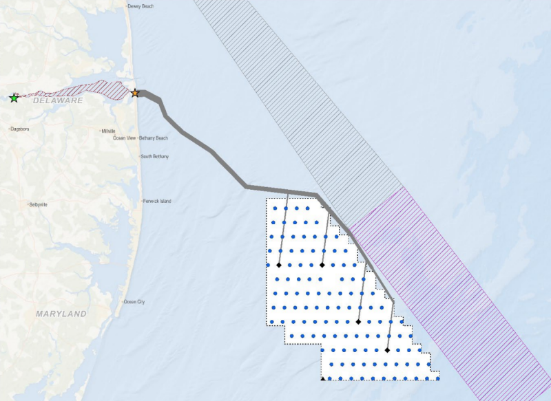 US Wind proposes building 114 wind turbines on its lease in federal waters 10 miles east of Ocean City, Md. At right are traffic separation lanes for Delaware Bay. US Wind image.