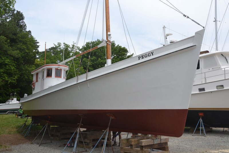 Here the Peggy is spit shined up on the hard at Deltaville Boat Yard in 2018. She will be doubly spit shined for her 100th birthday party in September. Larry Chowning photo.